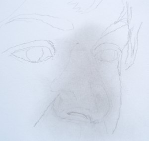 3. Kako bi dobili prvi, osnovni ton, osenčite ravnomerno 2H olovkom širu površinu gde se nalazi nos, pazeći pri tom da vam ne ostanu praznine. Zatim papirnom maramicom ili tuferom, sa što manje stiskanja, razmažite grafit po toj površini.